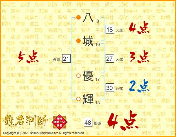 生活面を象徴する運勢です。外部から受ける影響力を表し、結婚運、家庭運や職場、環境への順応性を表します。総運から人運を引いた画数。姓や名が1文字の場合を除く。