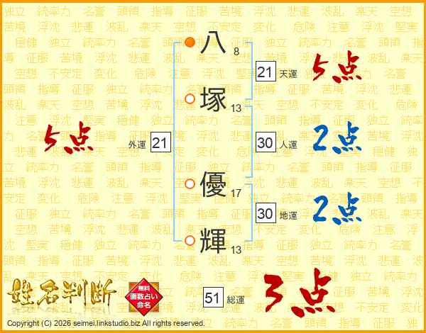 あなたの人生を表す1番重要な運勢です。生涯を通じて影響する総合運となり、主に50歳以降の晩年期に影響を及ぼします。苗字と名前の合計画数。