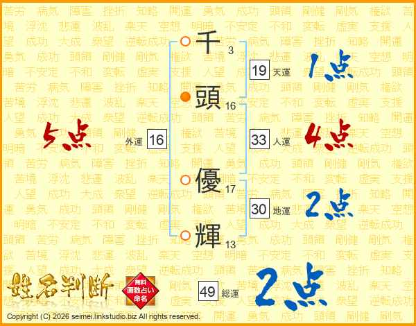 千(3画)頭(16画) 優(17画)輝(13画)