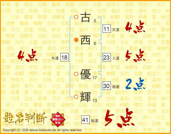 古(5画)西(6画) 優(17画)輝(13画)