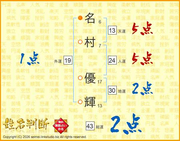 名(6画)村(7画) 優(17画)輝(13画)