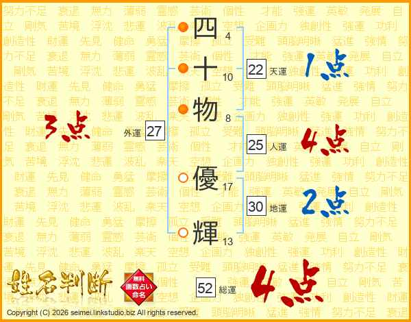 四(4画)十(10画)物(8画) 優(17画)輝(13画)