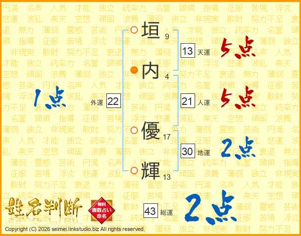 生活面を象徴する運勢です。外部から受ける影響力を表し、結婚運、家庭運や職場、環境への順応性を表します。総運から人運を引いた画数。姓や名が1文字の場合を除く。