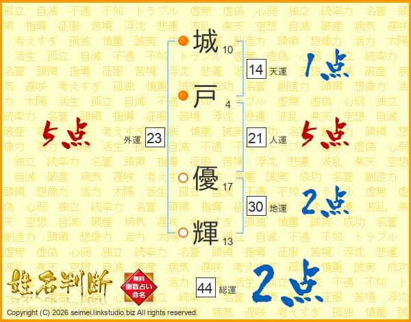 城(10画)戸(4画) 優(17画)輝(13画)