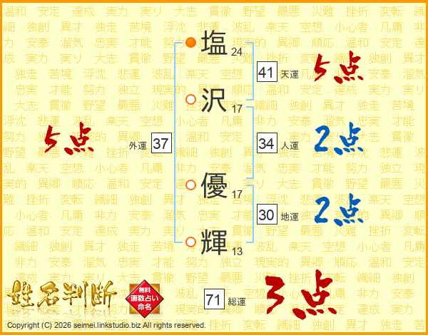 塩(24画)沢(17画) 優(17画)輝(13画)