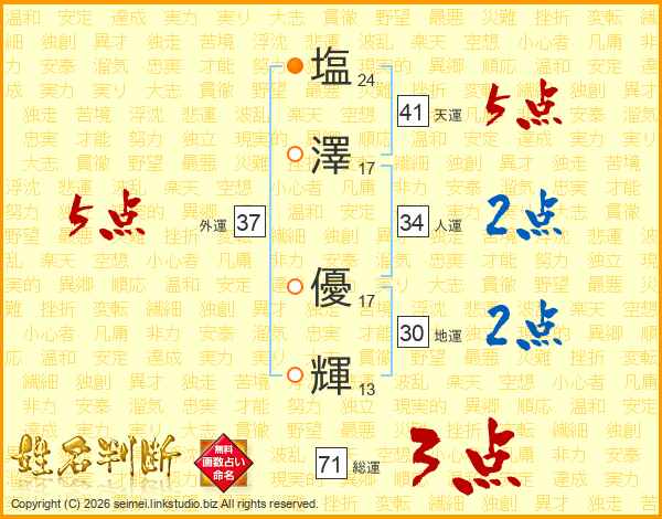 塩(24画)澤(17画) 優(17画)輝(13画)