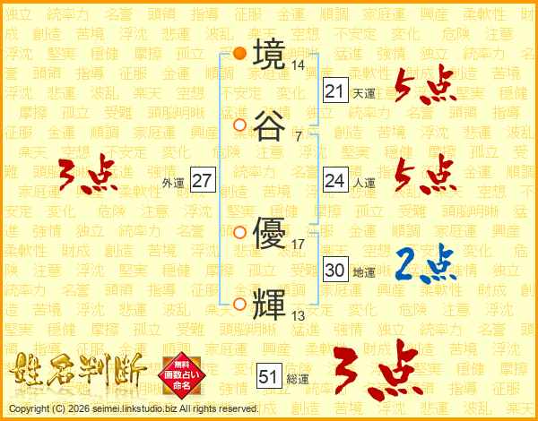 生活面を象徴する運勢です。外部から受ける影響力を表し、結婚運、家庭運や職場、環境への順応性を表します。総運から人運を引いた画数。姓や名が1文字の場合を除く。