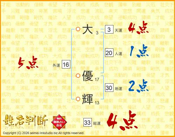 生活面を象徴する運勢です。外部から受ける影響力を表し、結婚運、家庭運や職場、環境への順応性を表します。総運から人運を引いた画数。姓や名が1文字の場合を除く。