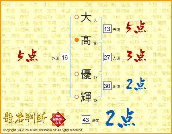 大髙優輝さんの総運は43画の2点!