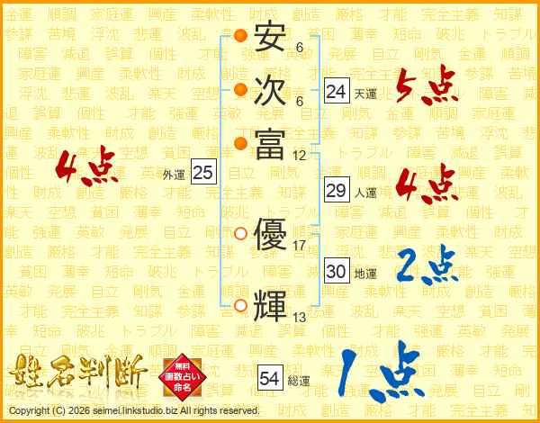 安(6画)次(6画)富(12画) 優(17画)輝(13画)