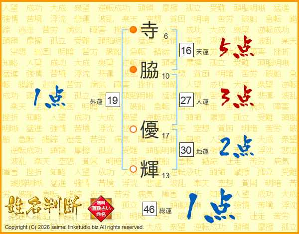 寺(6画)脇(10画) 優(17画)輝(13画)
