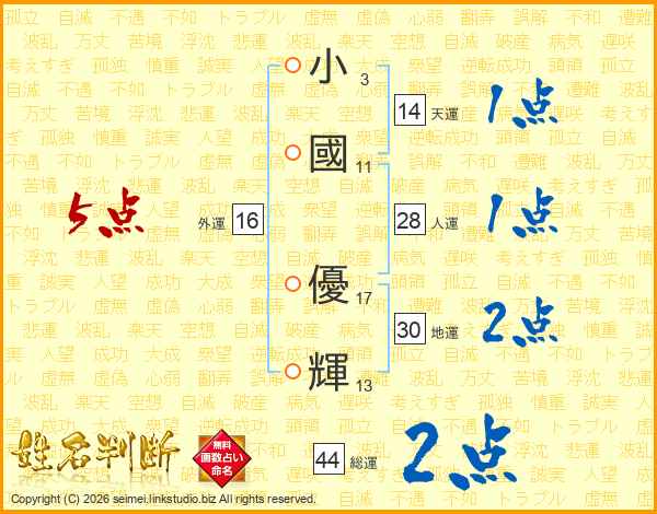 生活面を象徴する運勢です。外部から受ける影響力を表し、結婚運、家庭運や職場、環境への順応性を表します。総運から人運を引いた画数。姓や名が1文字の場合を除く。