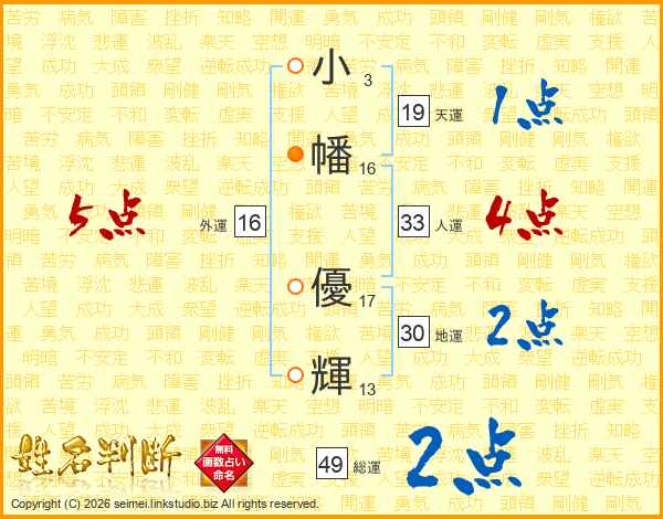 生活面を象徴する運勢です。外部から受ける影響力を表し、結婚運、家庭運や職場、環境への順応性を表します。総運から人運を引いた画数。姓や名が1文字の場合を除く。