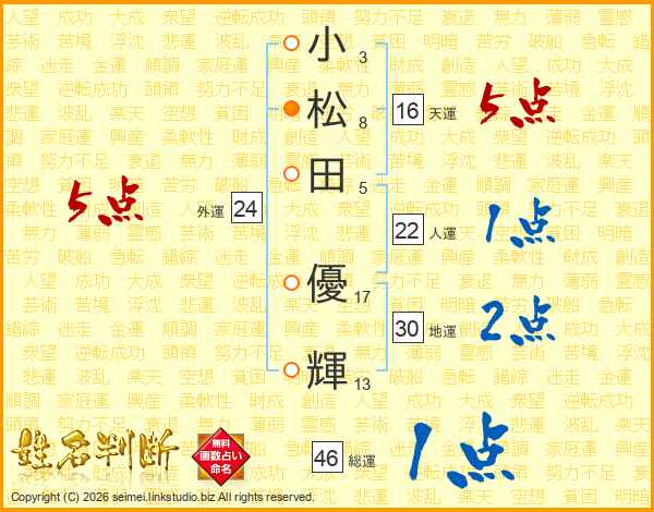 小(3画)松(8画)田(5画) 優(17画)輝(13画)