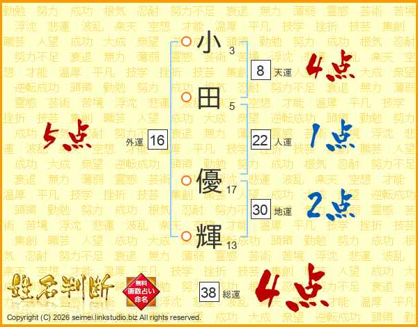 生活面を象徴する運勢です。外部から受ける影響力を表し、結婚運、家庭運や職場、環境への順応性を表します。総運から人運を引いた画数。姓や名が1文字の場合を除く。