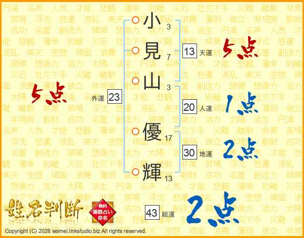 小(3画)見(7画)山(3画) 優(17画)輝(13画)