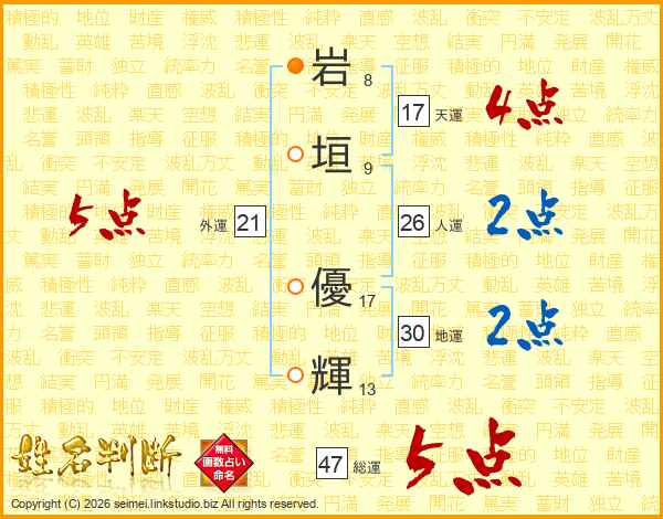 岩(8画)垣(9画) 優(17画)輝(13画)