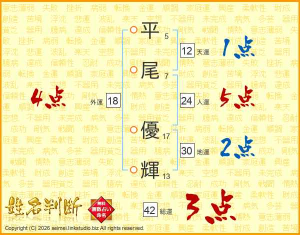 平(5画)尾(7画) 優(17画)輝(13画)