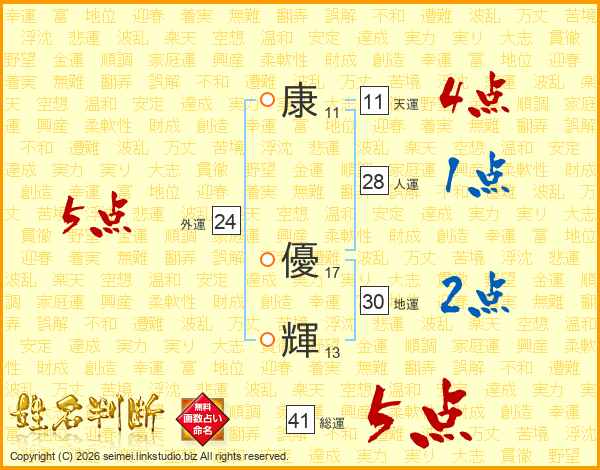 康(11画) 優(17画)輝(13画)