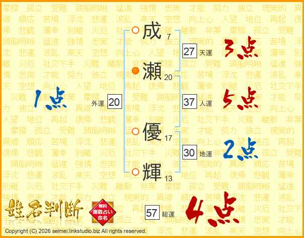 成(7画)瀬(20画) 優(17画)輝(13画)