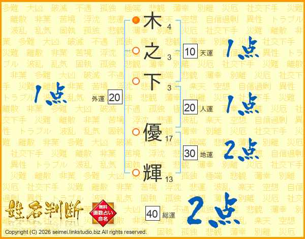 木(4画)之(3画)下(3画) 優(17画)輝(13画)