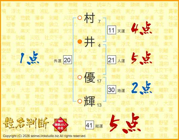 村(7画)井(4画) 優(17画)輝(13画)