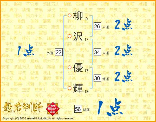 柳沢優輝さんの天運は26画の2点!