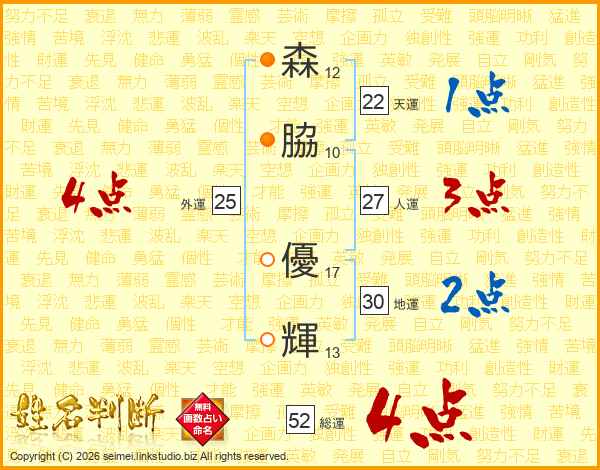 森(12画)脇(10画) 優(17画)輝(13画)