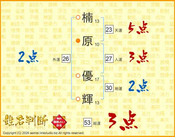 楠(13画)原(10画) 優(17画)輝(13画)