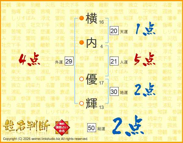 横(16画)内(4画) 優(17画)輝(13画)