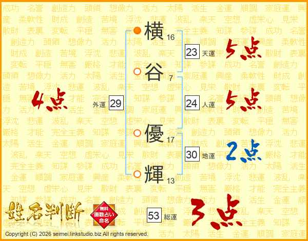 横(16画)谷(7画) 優(17画)輝(13画)