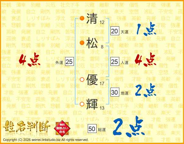清(12画)松(8画) 優(17画)輝(13画)