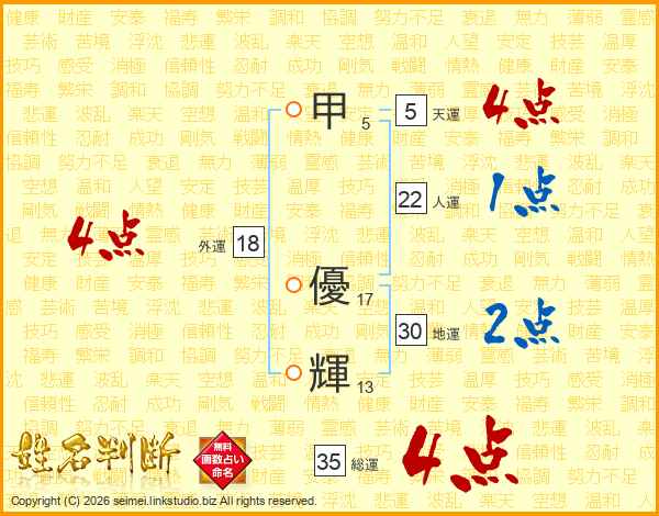 甲(5画) 優(17画)輝(13画)