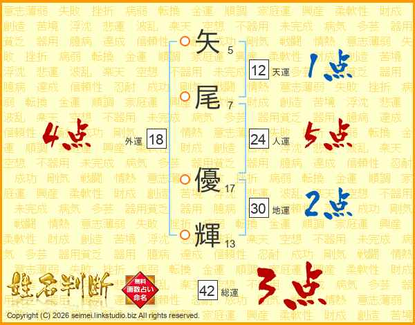 矢(5画)尾(7画) 優(17画)輝(13画)