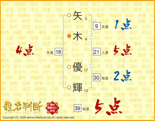 矢(5画)木(4画) 優(17画)輝(13画)