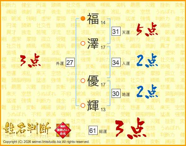福(14画)澤(17画) 優(17画)輝(13画)