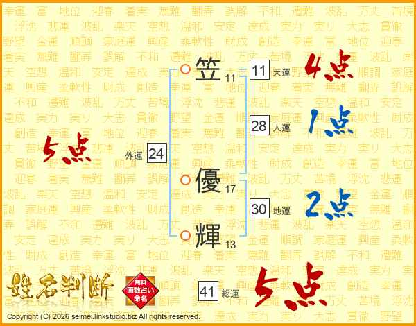 笠(11画) 優(17画)輝(13画)
