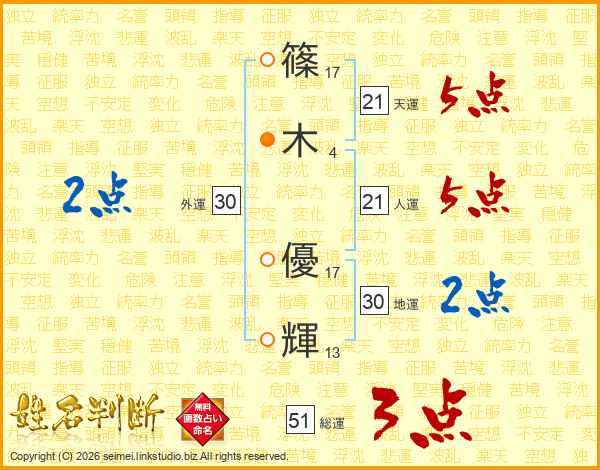篠(17画)木(4画) 優(17画)輝(13画)
