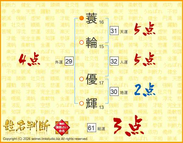 蓑(16画)輪(15画) 優(17画)輝(13画)