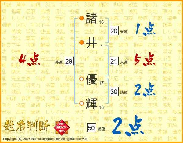 生活面を象徴する運勢です。外部から受ける影響力を表し、結婚運、家庭運や職場、環境への順応性を表します。総運から人運を引いた画数。姓や名が1文字の場合を除く。