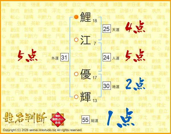 鯉(18画)江(7画) 優(17画)輝(13画)