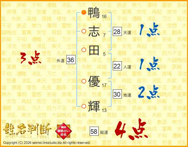 鴨(16画)志(7画)田(5画) 優(17画)輝(13画)