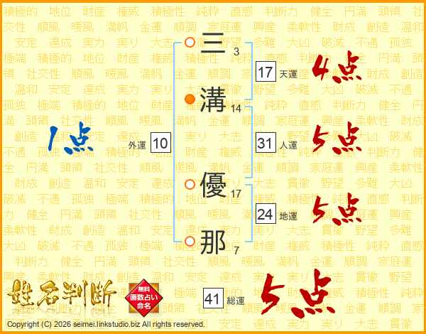 生活面を象徴する運勢です。外部から受ける影響力を表し、結婚運、家庭運や職場、環境への順応性を表します。総運から人運を引いた画数。姓や名が1文字の場合を除く。