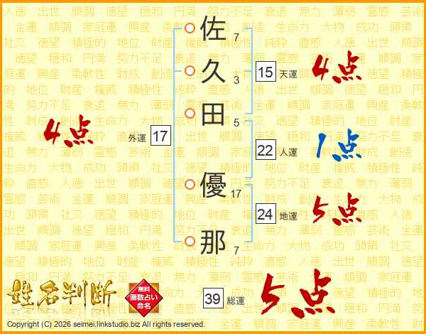 佐(7画)久(3画)田(5画) 優(17画)那(7画)