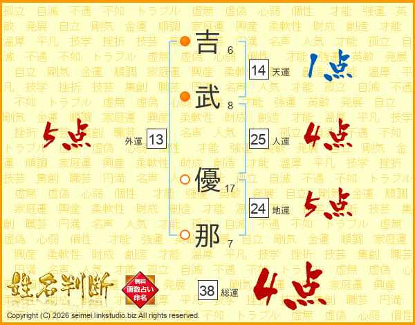 吉(6画)武(8画) 優(17画)那(7画)