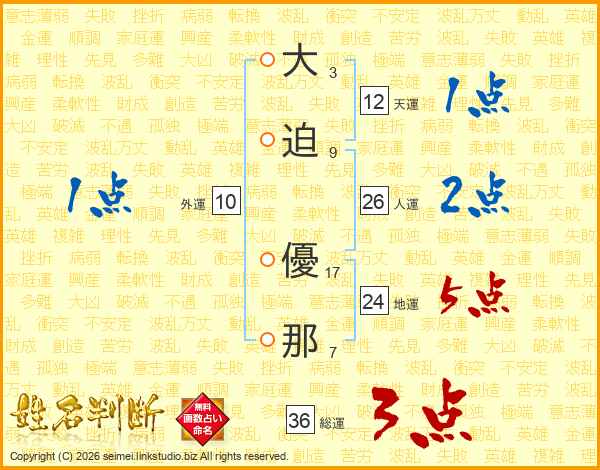 大(3画)迫(9画) 優(17画)那(7画)