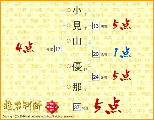 小見山優那さんの総運は37画の5点!