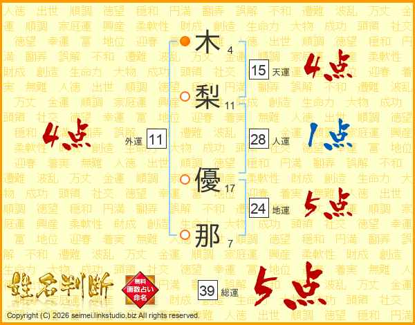木(4画)梨(11画) 優(17画)那(7画)
