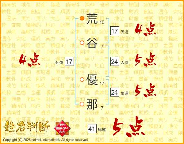 荒(10画)谷(7画) 優(17画)那(7画)