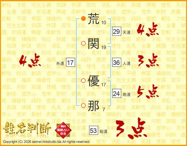 生活面を象徴する運勢です。外部から受ける影響力を表し、結婚運、家庭運や職場、環境への順応性を表します。総運から人運を引いた画数。姓や名が1文字の場合を除く。